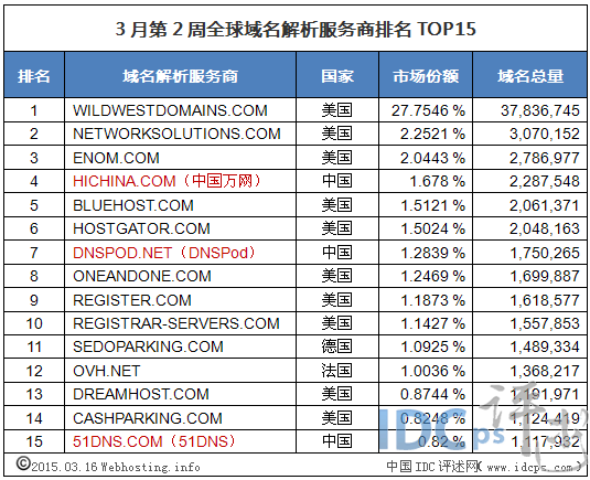 IDC評述網(idcps.com)03月23日報道:據WebHosting.info公布的最新數據顯示,在3月第2周,WILDWESTDOMAINS.COM以域名總量37,836,745個打敗全球眾多域名商,凈增86,588個,漲幅最大。另外,在前十五強中,中國占據3個席位,分別是中國萬網、DNSPod與51DNS。下面,請看詳盡的數據分析。